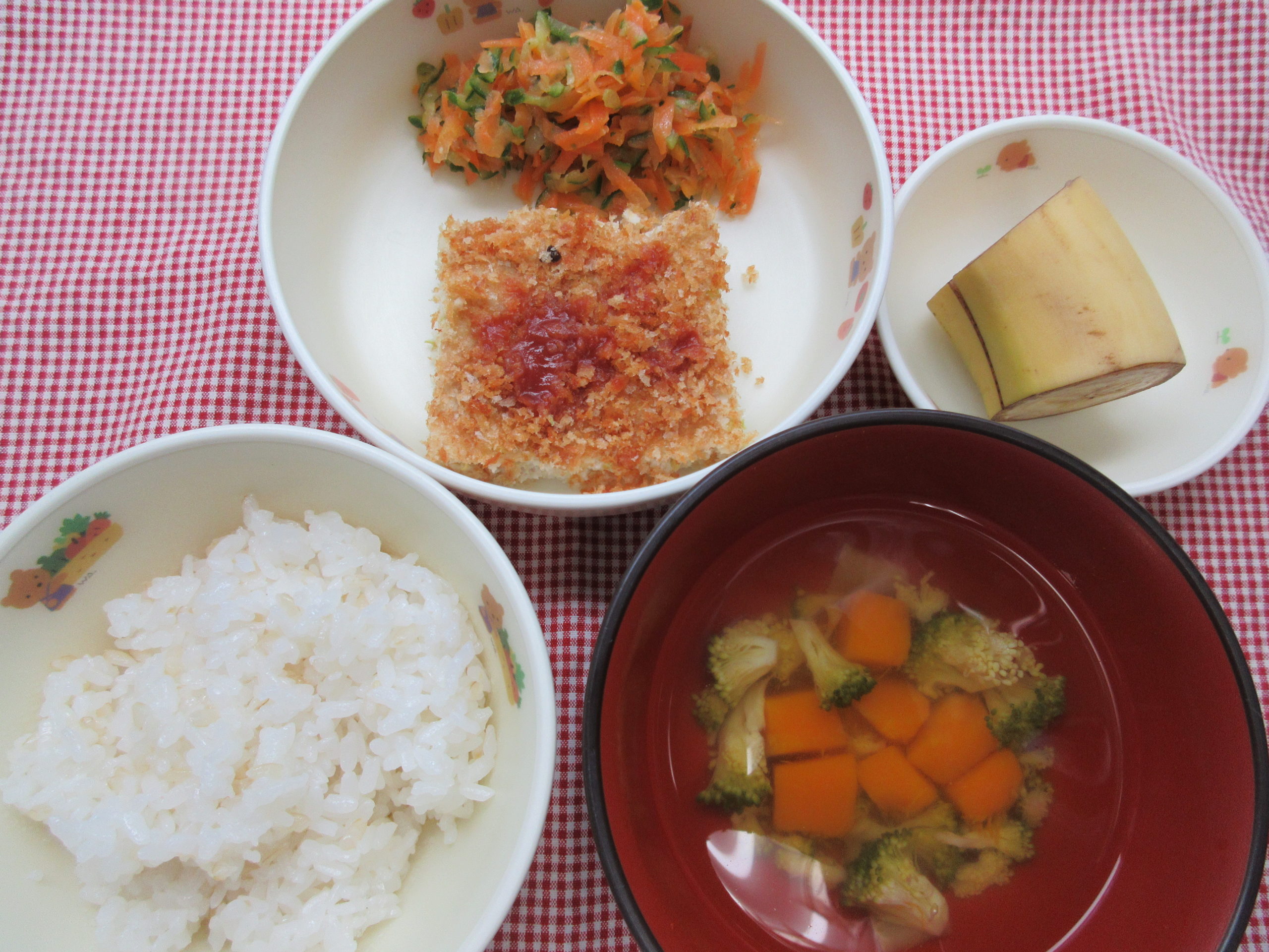 3月26日(木)幼児食お昼:いちごジャムサンド、スイートスタミナチキン、切干し大根のしょうゆフレンチ、パンプキンポタージュ、フルーツ