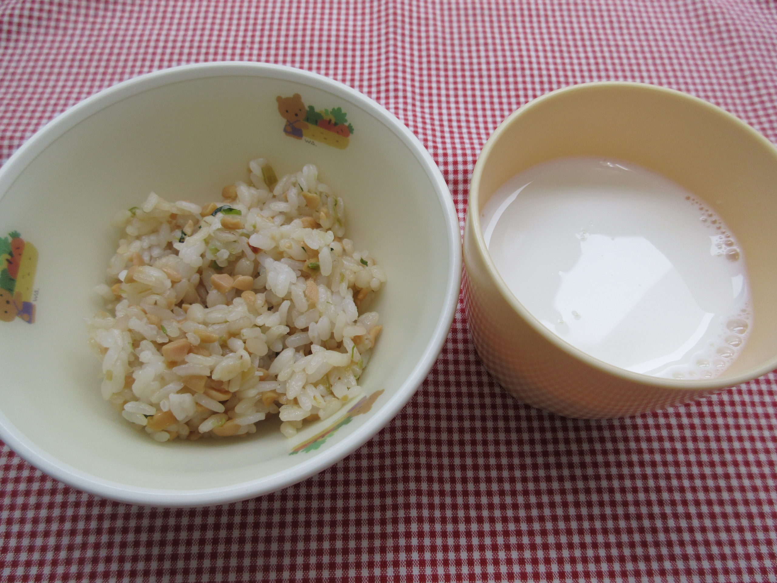 3月27日(金)幼児食おやつ:牛乳、かぶの葉入り納豆チャーハン