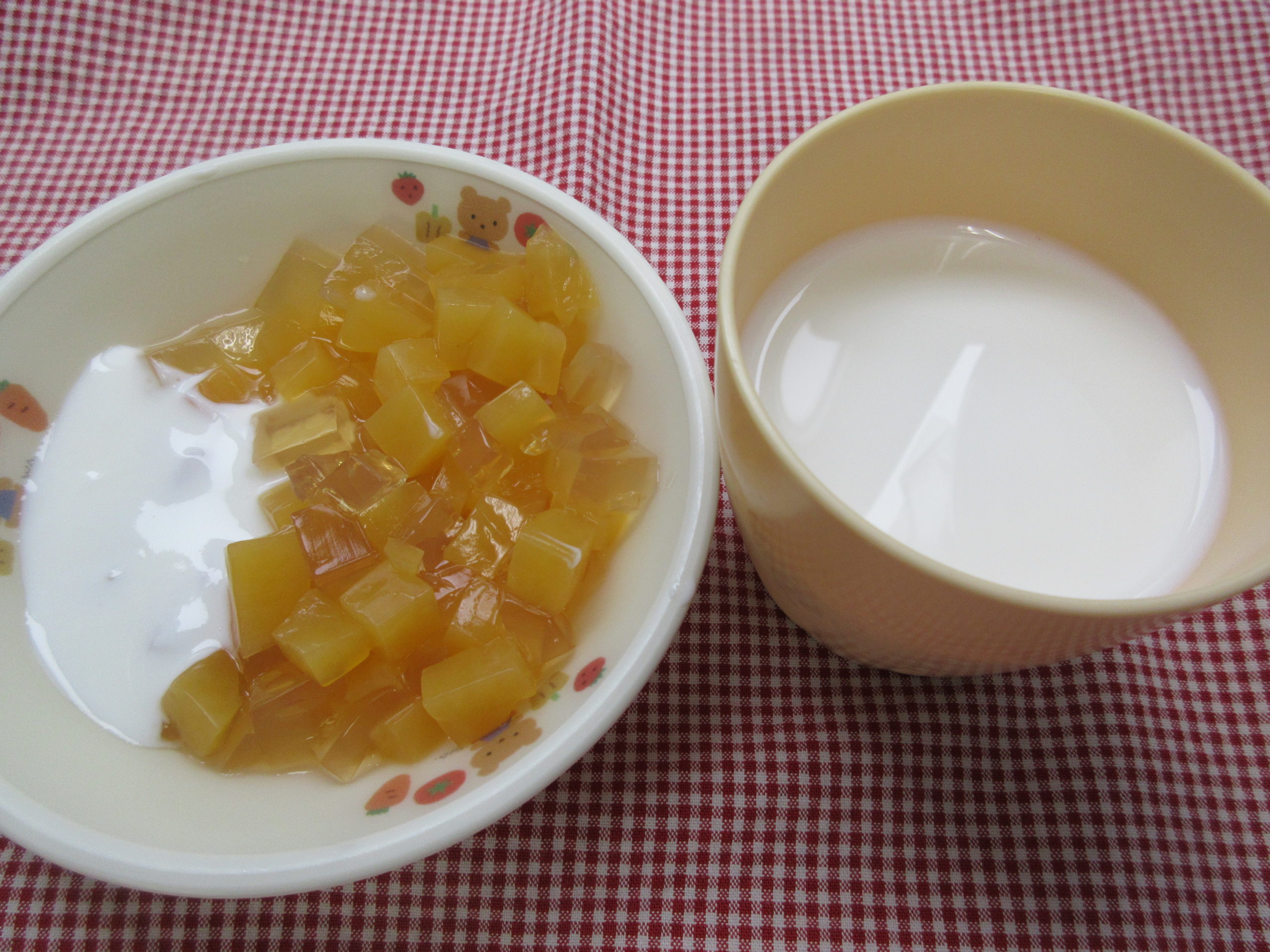 3月26日(木)幼児食おやつ:牛乳(乳児:豆乳)、フルーツ寒天のヨーグルトソース